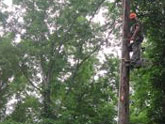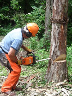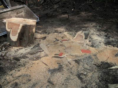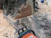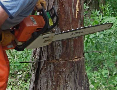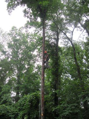 The whole upper story of the tree had been bolted and cabled together in a mutual support system as a precaution against calamity. But now the lead leaning away was fractured and the bolt blown loose. Its mate, previously held in equilibrium by the cable, shared the blow and was left leaning dangerously over the house.