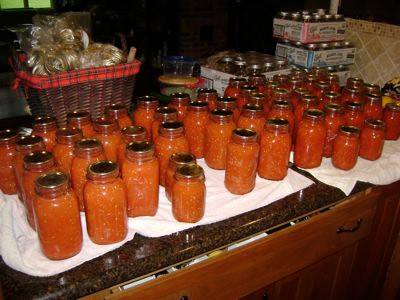 It's been a busy week, what with the reunion, butchering and the garden coming flush. In the span of seven days, Mary and I processed 24 pints of chicken gizzards and hearts, 54 pints of pole beans, 50 qts of tomatoes, and four qts of cased fresh bratwurst left over from the reunion. Along with the brats, I canned a qt of venison stew chunks and a qt of chicken livers, thawed from '08 packages and intended for use as catfish bait, but more than I needed for the moment.